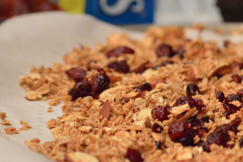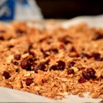 - Pour onto a baking sheet lined with parchment paper, and place into oven for 40 minutes. Stir every 10 minutes or so to make sure to cook evenly. Mix cranberries in granola at the end before cooling.