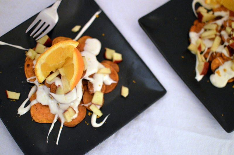 I found that apples and oranges (two fruits we happen to have fresh in the house) pair well with sweet potatoes. I diced up a small apple we had in the kitchen (diced small like in a pico de gallo), and tossed them with juice from half the orange to prevent any browning and to add a subtle orange flavor. Also, allspice is a top spice that pairs with sweet potatoes. Before baking, I tossed the potato slices with some grapeseed oil, cinnamon, sugar and allspice, then I spread them out on a cooling rack set on a baking dish and cooked at 425^ for 20-30 minutes until starting to crisp.