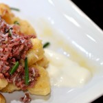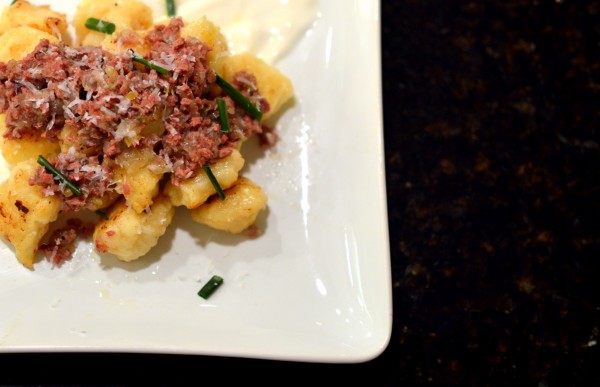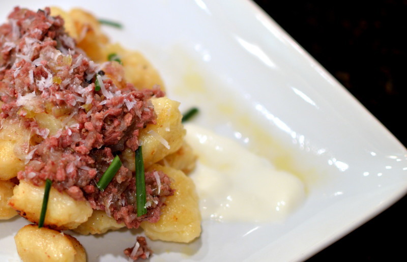 - Spoon the sour cream onto 4 plates and top with the gnocchi and pastrami ragù. Garnish with the chives and serve.